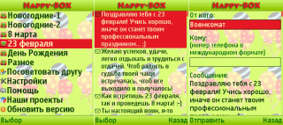 «Happy-BOX» – это уникальный сборник смс-поздравлений с функцией анонимной отправки. Благодаря ему Вы сможете приятно удивлять в праздники своих друзей и знакомых, отправляя им замечательные поздравления от Президента, Деда Мороза, Всевышнего и т.д. В приложении имеется более 200 оригинальных шаблонов смс с поздравлениями на все случаи жизни, представленных в 6 основных разделах: День рождения, 8 марта, 23 февраля, Новогодние-1, Новогодние-2, Разное. | ||